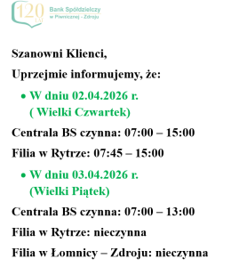 Rok 2026 jest dla Banku Spółdzielczego w Piwnicznej – Zdroju rokiem szczególnym. W tym czasie obchodzimy jubileusz 120-lecia działalności Banku, który od ponad wieku nieprzerwanie pełni ważną rolę w życiu lokalnej społeczności.